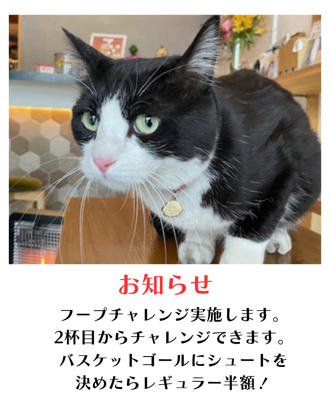 二杯目から挑戦できます。 ミニバスケゴールにシュートを決めたらレギュラーグラスのビールが半額! シュートは3回まで打てますよ。